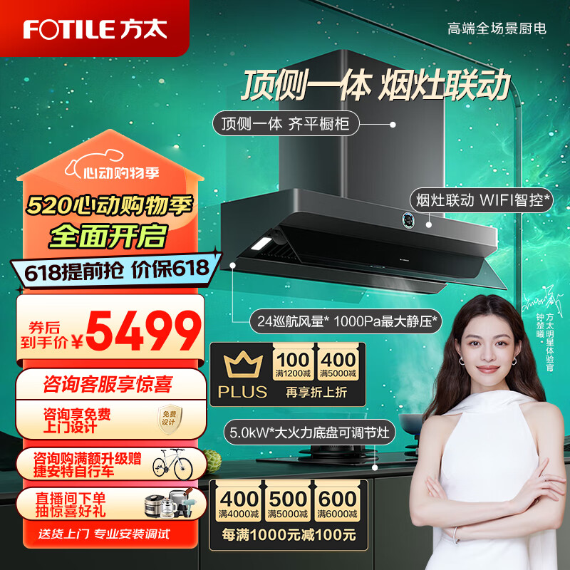 方太(FOTILE)F2抽吸油烟机灶具烟灶套装顶侧一体齐平橱柜 变频24巡航风量烟灶联动套餐F2.i+THF1A天然气/液化气价格:6099.00元!