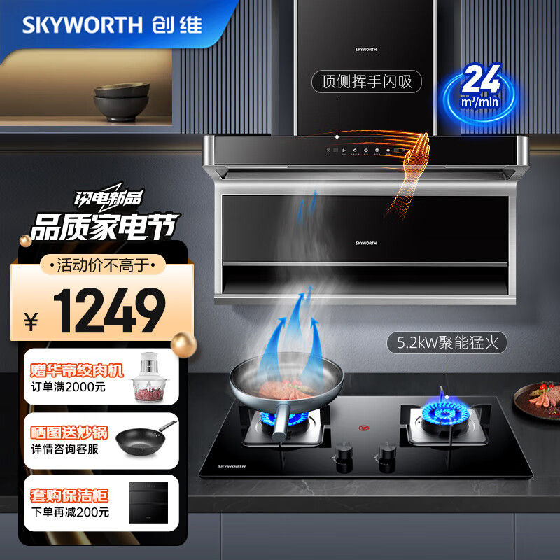 创维(Skyworth)7字顶侧双吸抽吸油烟机灶具套装家用24风量排油烟机燃气灶套餐烟灶自动清洗挥手Y7K+Z50BS-1天然气价格:1299.00元!