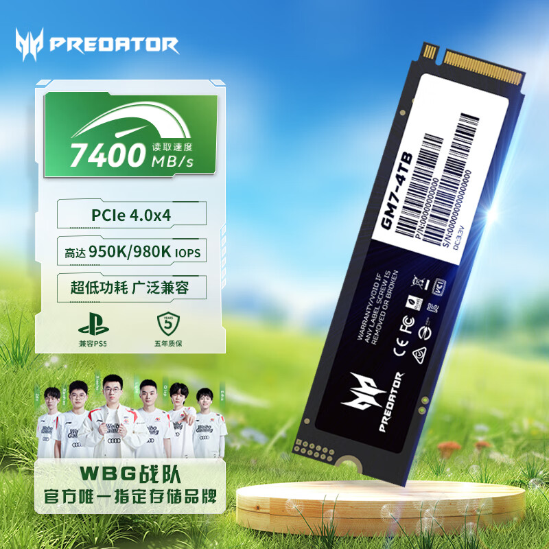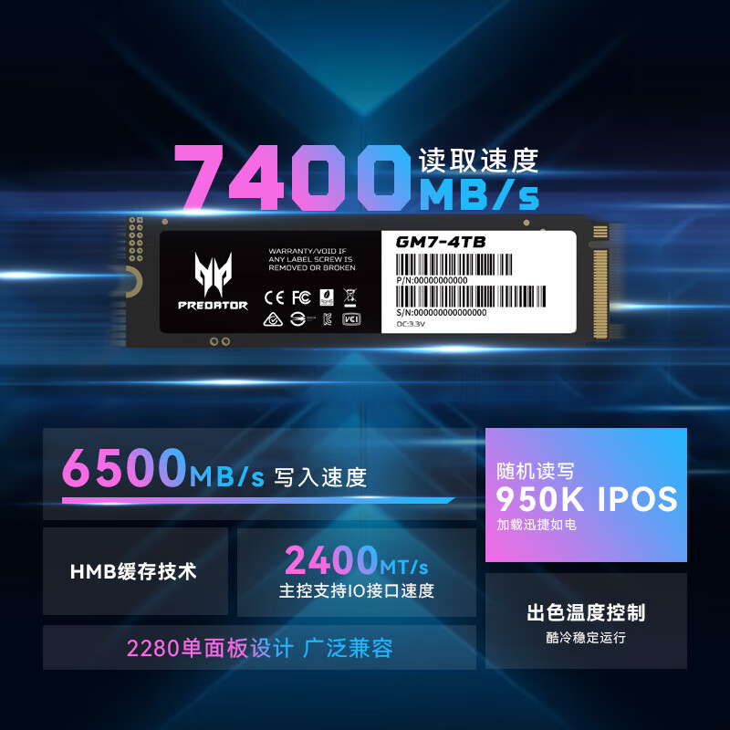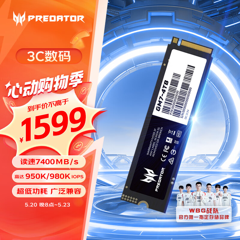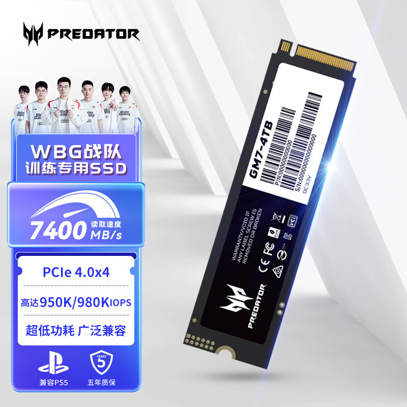 宏碁掠夺者(PREDATOR)4TB SSD固态硬盘 M.2接口(NVMe协议) GM7系列|NVMe PCIe 4.0读速7400MB/s AI电脑存储配件价格:1599.00元!