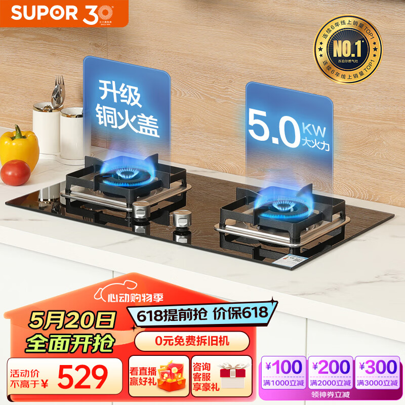 苏泊尔(SUPOR)燃气灶双灶家用 天然气灶双灶具 5.0kW家用猛火灶 钢化玻璃双灶台嵌两用全进风 Q5天价格:529.00元!