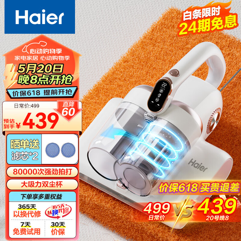海尔除螨仪双杯尘螨分离家用床上超声波除螨虫紫外线杀菌大吸力吸尘神器8万次拍打C9W价格:439.00元!