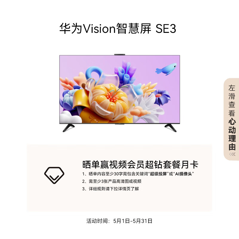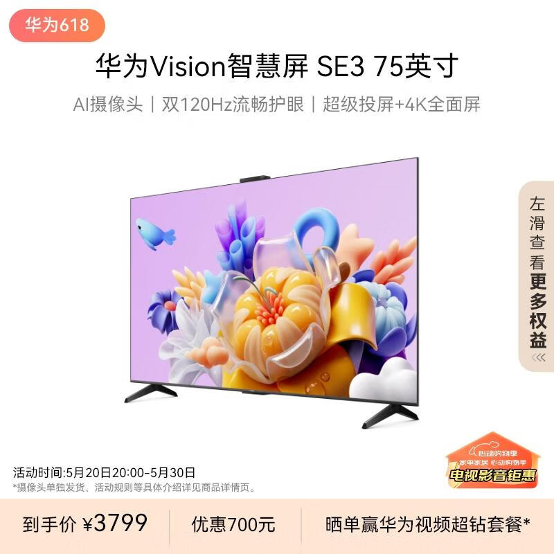 华为Vision智慧屏SE3 75英寸 Pura 70投屏好搭档 AI摄像头4K超高清智能液晶超薄电视机HD75KUNA价格:3799.00元!