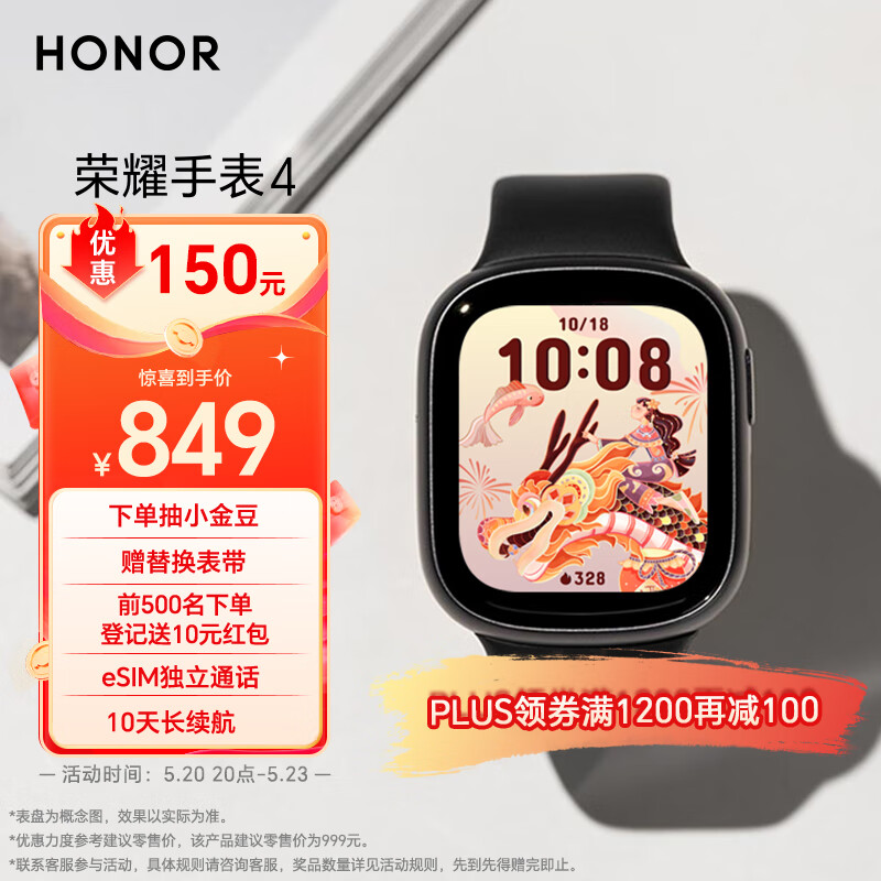 荣耀手表4 曜石黑 eSIM独立通话 10天长续航 全智能手表 男女运动手表 血氧心率监测 龙年表盘新年礼物价格:849.00元!
