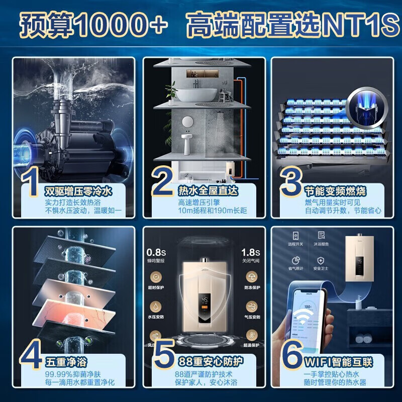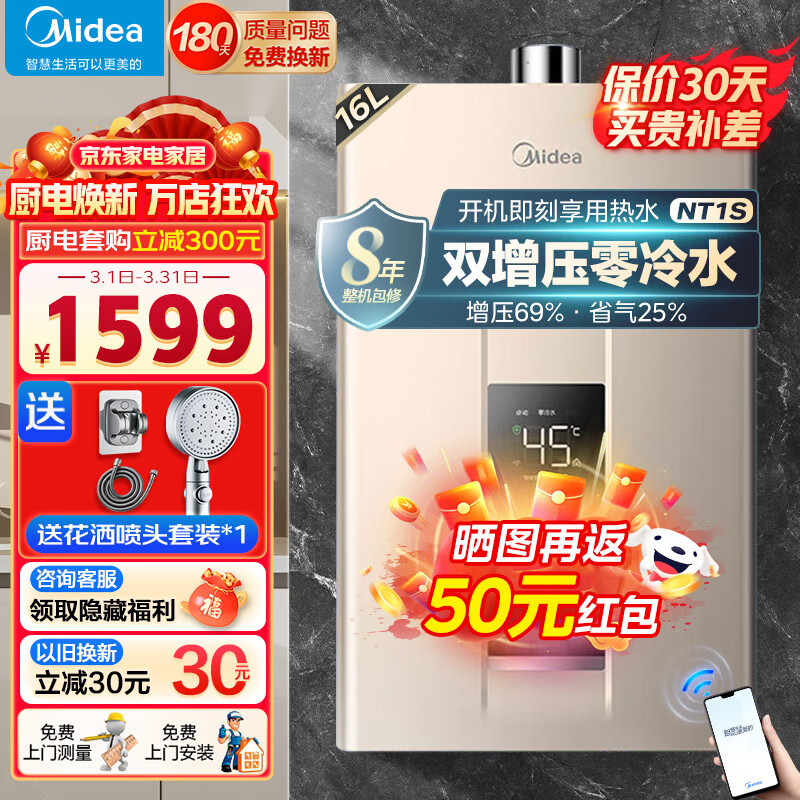 美的(Midea)16升燃气热水器 燃气天然气家用双增压零冷水变频节能省气智能操控恒即开即热以旧换新JSQ30-NT1S价格:1599.00元!