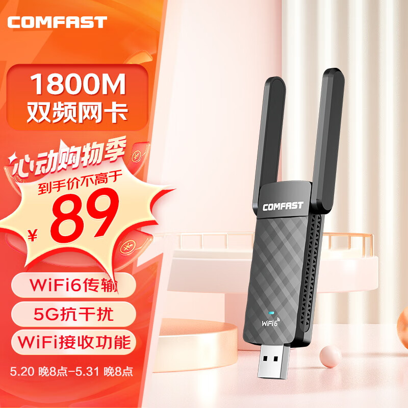 COMFAST CF-952AX 千兆1800M双频5G外置USB无线网卡台式机电脑主机WIFI6接收器笔记本信号穿墙价格:109.00元!