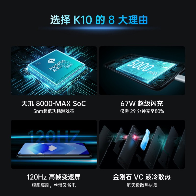 OPPO K10 冰魄蓝 8GB+256GB 天玑 8000-MAX 金刚石VC液冷散热 120Hz高帧变速屏 旗舰5G手机价格:1799.00元!