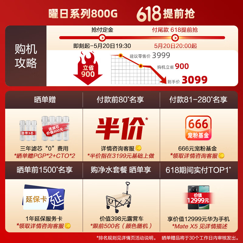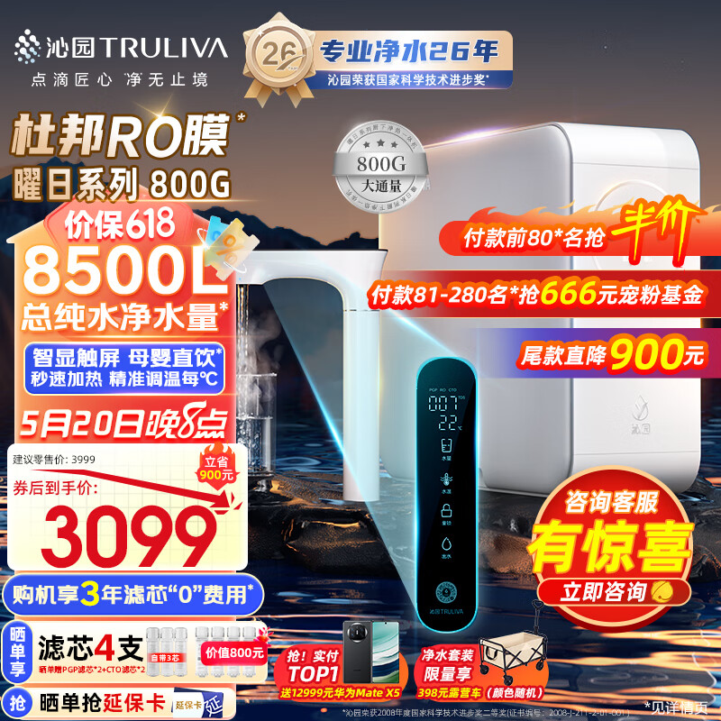 沁园(TRULIVA)曜日加热净水器800G 5年RO反渗透 智能触控屏精准调温 家用厨下即热直饮一体机 UR-S5846H价格:3199.00元!