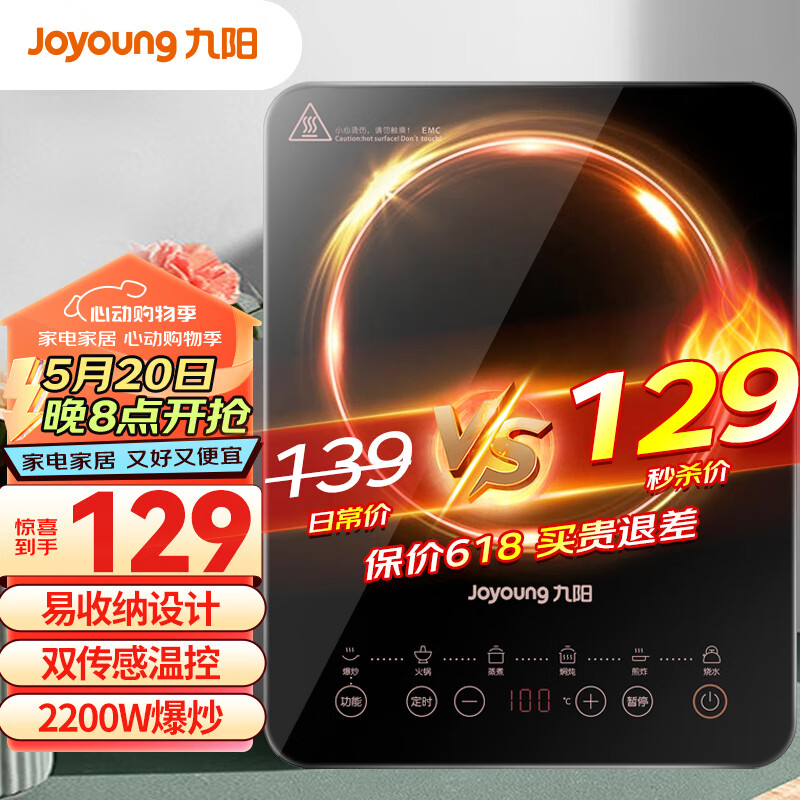 九阳(Joyoung)电磁炉 2200W大功率可收纳电源一键猛火家用电磁炉火锅炉C21S-C152单机版价格:129.00元!