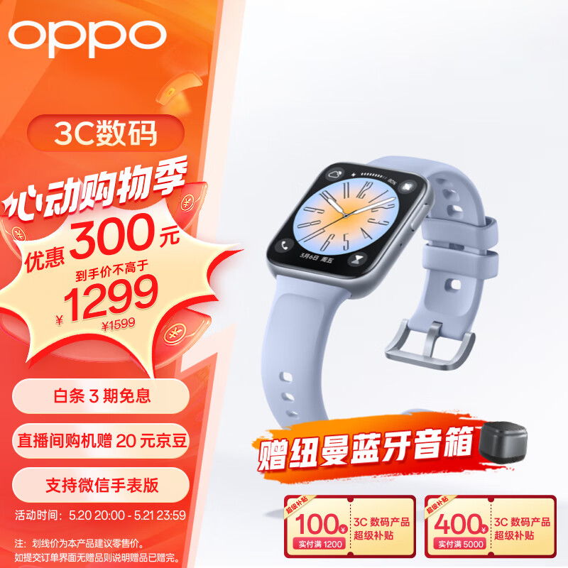 OPPO Watch 3 溢彩蓝 全智能手表 运动健康手表男女eSIM电话手表 血氧心率监测 适用iOS安卓鸿蒙手机价格:1299.00元!