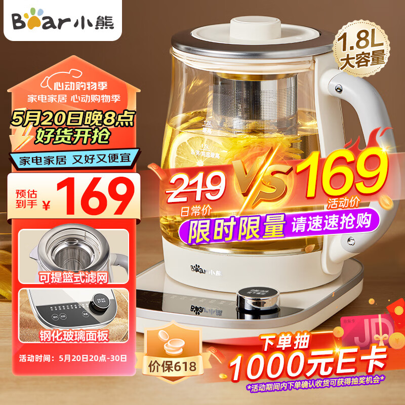 小熊(Bear)养生壶 1.8L大容量玻璃面板 煮茶壶煮茶器 恒温保温一体烧水壶电水壶 YSH-E18J1 大口径滤网价格:169.00元!