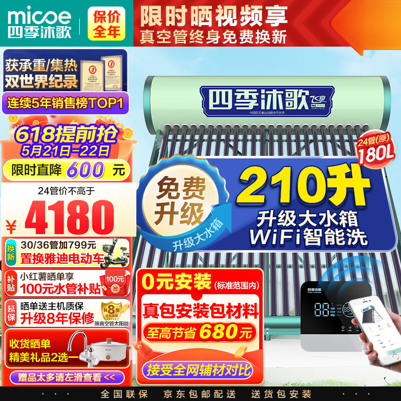 四季沐歌(MICOE)飞享WIFI智控太阳能热水器 家用光电两用 自动上水 带电加热 6分独立双管口 24管180L送货+安装价格:4180.00元!