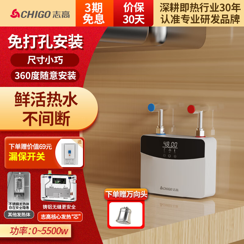志高(CHIGO)即热式电热水器小厨宝5500W 迷你家用电热水龙头加热器 集成免储水 过水热水宝 送漏保 ZG-KB518价格:258.00元!
