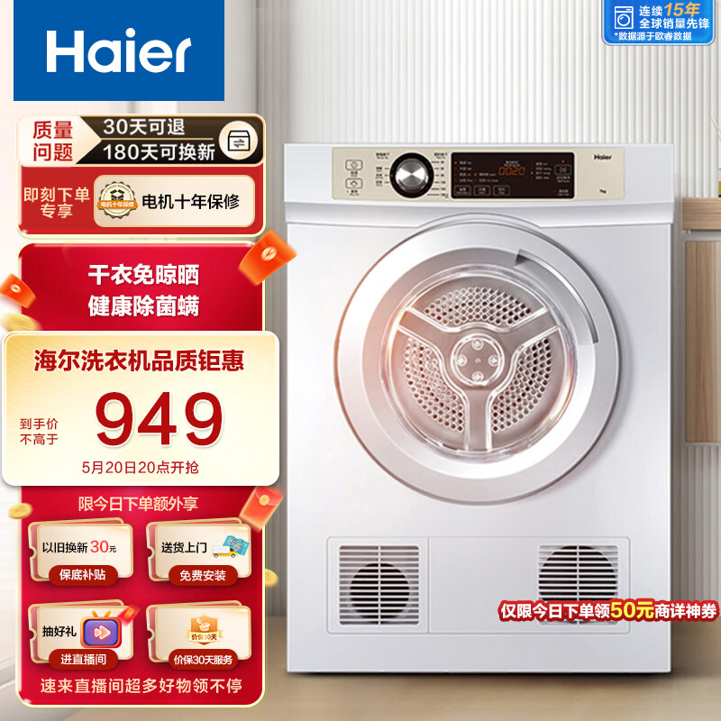 海尔(Haier)烘干机家用 7公斤直排小型干衣机烘衣机 除菌除螨除潮 速烘节能 衣干即停 防皱 EGDZE7F 以旧换新价格:999.00元!
