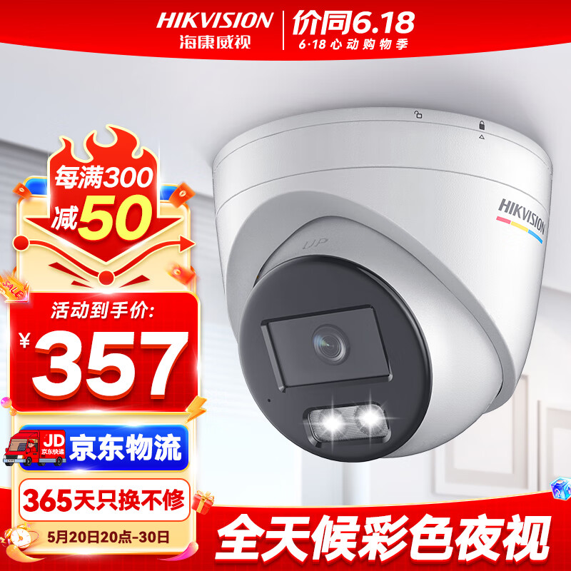 HIKVISION海康威视摄像头监控臻全彩夜视高清200万室内室外1080P画面手机远程POE供电半球3327WDV3-L 4MM价格:407.00元!