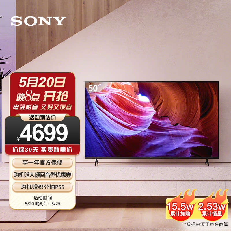 索尼(SONY)【官方直营】KD-50x85K 50英寸 4K HDR 屏智能电视 广色域 120Hz高刷 X1芯片 京配上门价格:4799.00元!