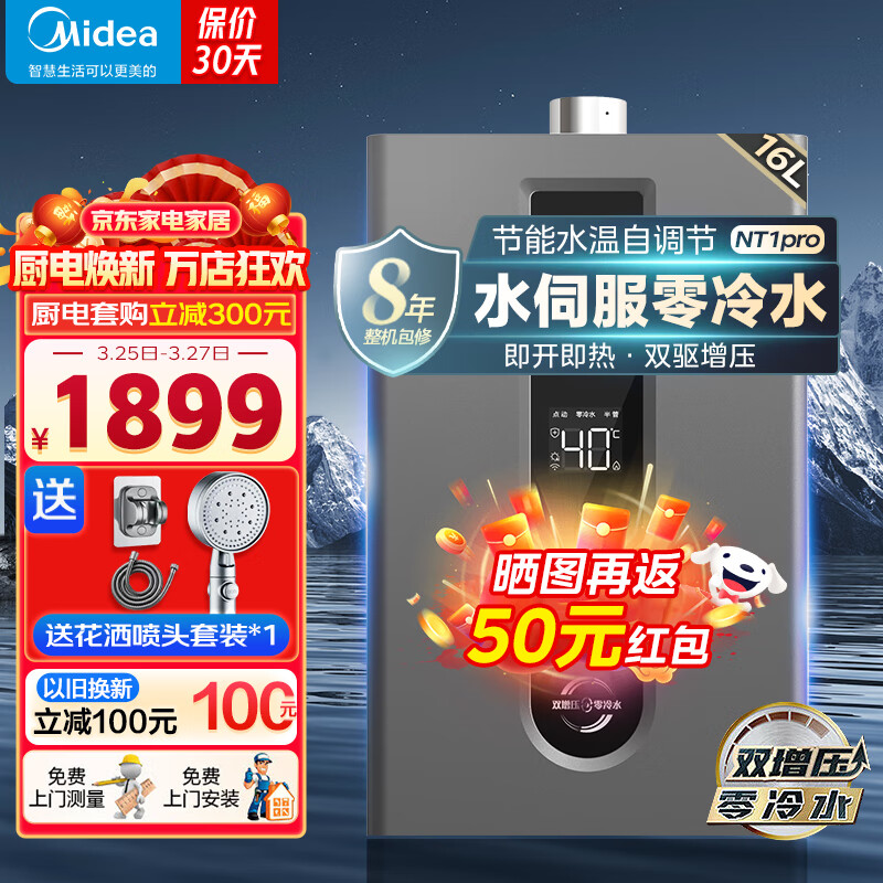 美的(Midea)16升燃气热水器天然气零冷水家用恒温即开即热式强排式智控增压水伺服以旧换新JSQ30-NT1 pro价格:1999.00元!