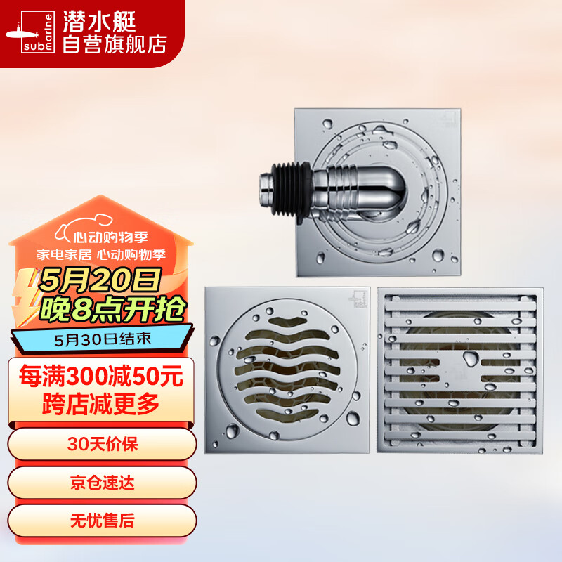 潜水艇(Submarine)黄铜镀铬防臭地漏套装50管 大排量淋浴+干湿区+全密封洗衣机价格:280.00元!