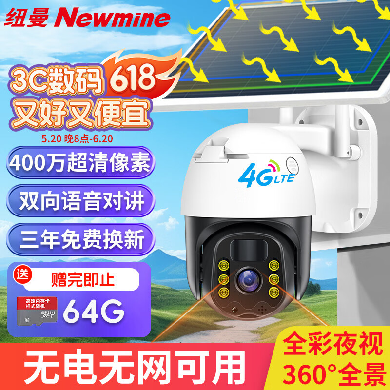纽曼4g太阳能摄像头室外无电无网农村户外手机远程无线监控器家用360度无死角带夜视全景全彩需充值价格:159.00元!