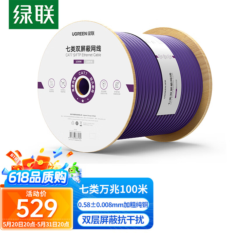 绿联 七类万兆双屏蔽网线【0.58±0.008mm纯铜线芯】CAT7类双绞 POE监控工程家装布线网络箱线 100米价格:569.00元!