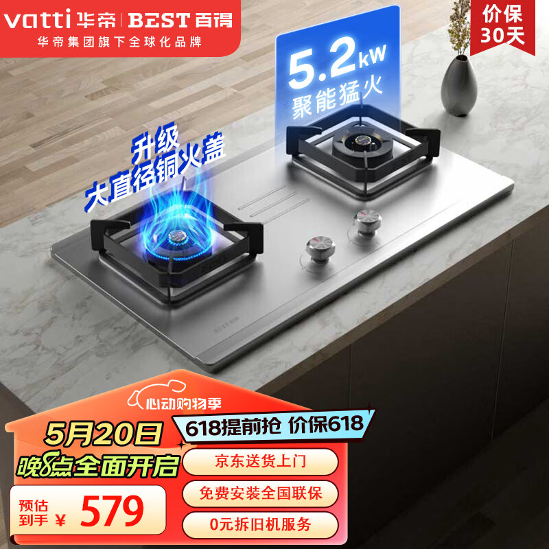 百得(BEST)华帝出品 煤气灶燃气灶天然气液化气双灶炉具 5.0KW家用不锈钢面板猛火台嵌入两用式灶JZY-QE52G价格:679.00元!