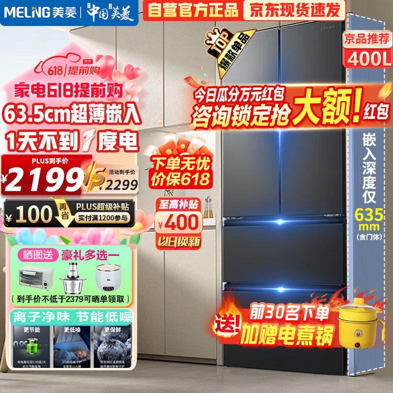 美菱(MeiLing)400升超薄法式多门嵌入双变频冰箱家用风冷无霜大容量四门电冰箱60cm超窄 63.5cm节能BCD-400WP9CX价格:2399.00元!