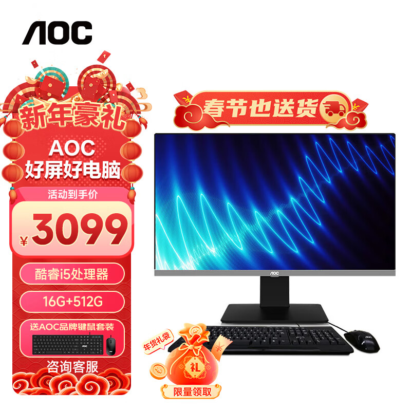 AOC大师926 27英寸高清办公台式一体机电脑(11代酷睿i5处理器 16G 512G 双频WiFi 3年上门 键鼠)黑价格:3099.00元!