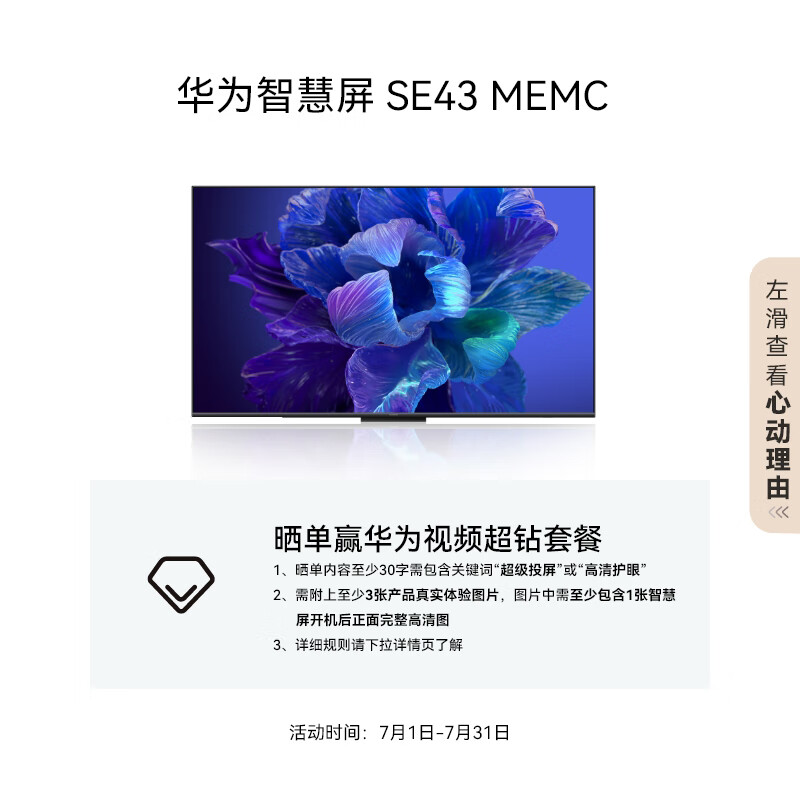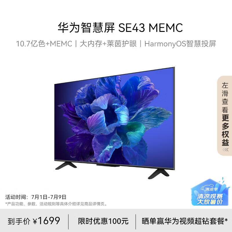 华为智慧屏 SE43 MEMC 43英寸超薄屏4K超高清智能液晶电视机卧室护眼2+16GB 以旧换新HD43KHAA价格:1699.00元!