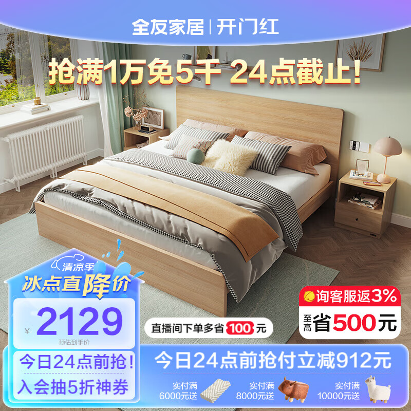 全友家居北欧原木风主卧室双人大床1.8米2米现代简约板式床家具106318价格:3041.43元!