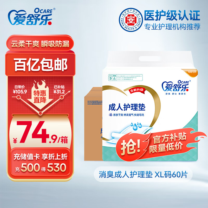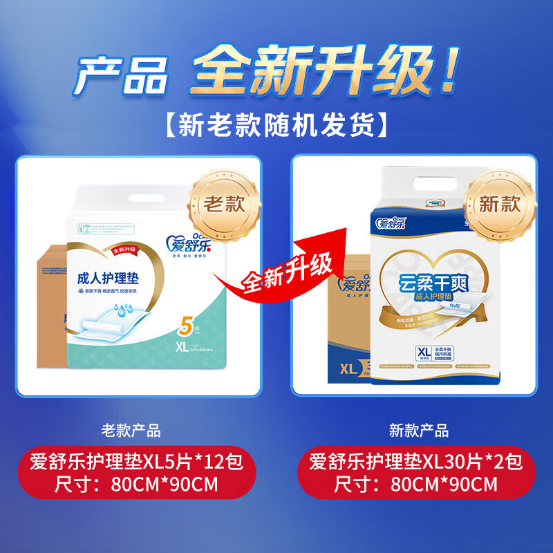 爱舒乐 成人护理垫XL60片(尺寸:80cm*90cm) 老人隔尿垫 产妇产褥垫 尿垫价格:74.70元!