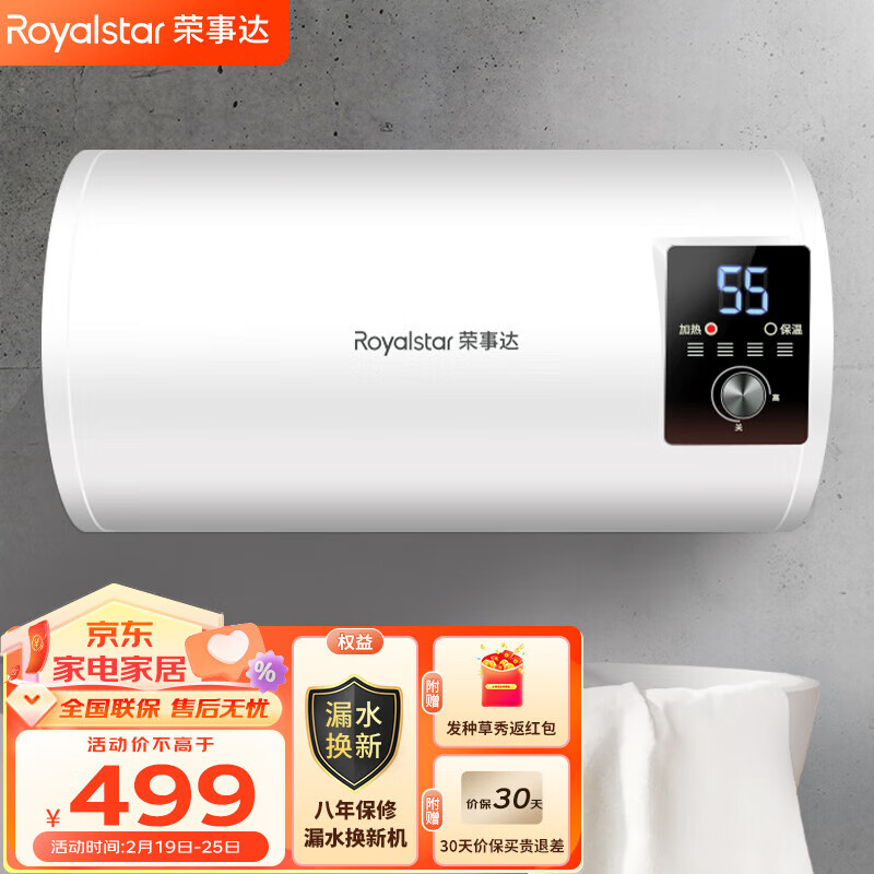 荣事达(Royalstar)电热水器家用储水式热水器卫生间洗澡小户型速热租房优选 防护 60L (3人)价格:496.00元!