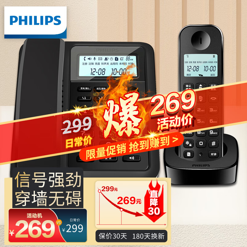 飞利浦(PHILIPS)数字无绳电话机 无线座机 子母机 办公家用 信号覆盖广 屏幕白色背光 DCTG167一拖一黑色价格:269.00元!