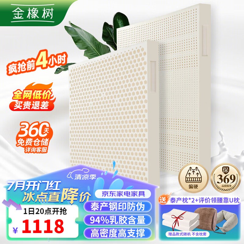 金橡树泰国原产进口天然乳胶床垫1.8米*2米 厚5cm 94%乳胶含量泰优95D价格:1799.00元!