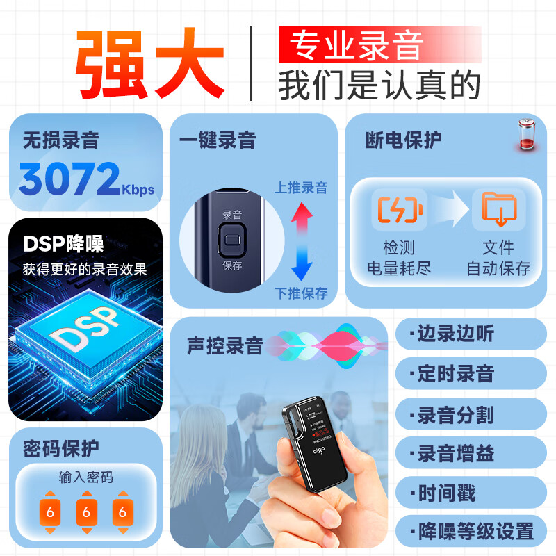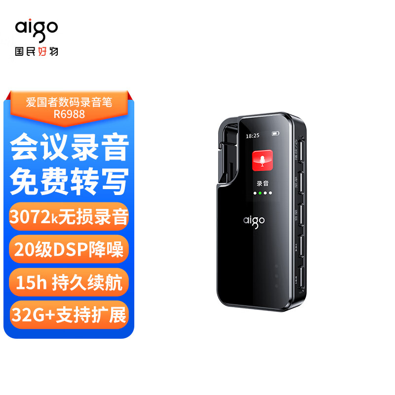 爱国者aigo录音笔R6988 32G 一键录音智能商务录音器专业录音 高清降噪录音笔 学习会议采访 黑色价格:259.00元!