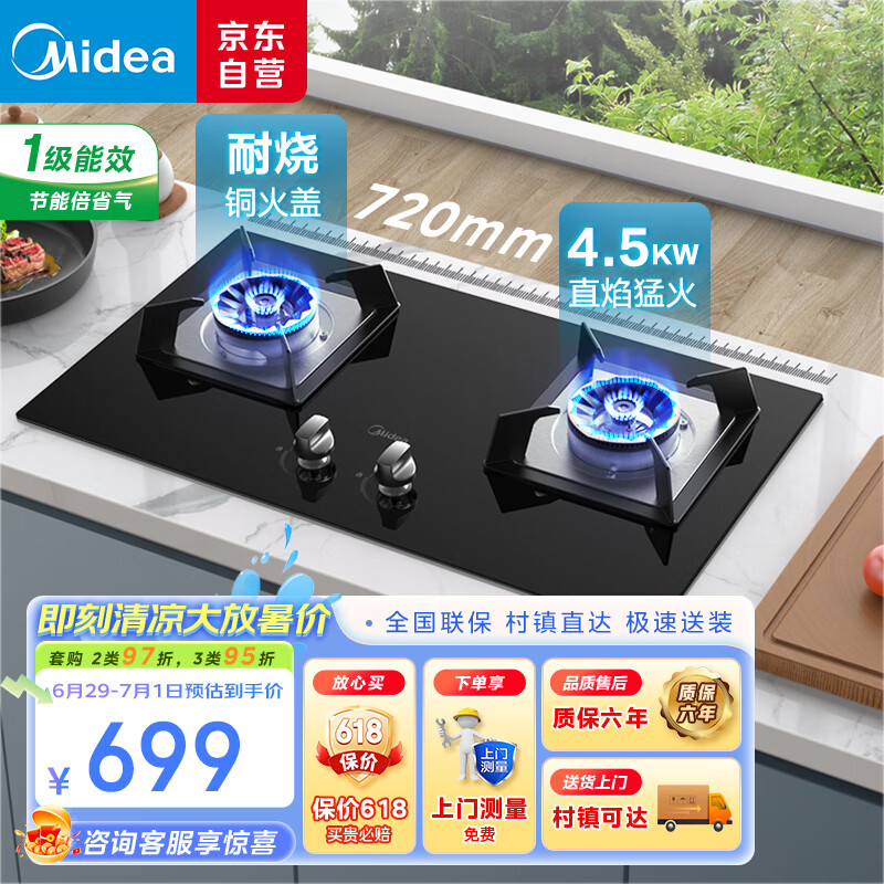 美的(Midea)燃气灶天然气 双眼灶 铜火盖 4.5kW大火力灶具 家用嵌入式 Q217A-M价格:699.00元!