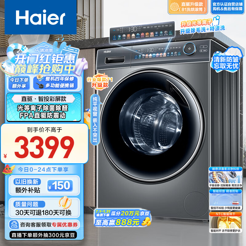 海尔(Haier)滚筒洗衣机全自动 10公斤洗烘一体机 【直驱EG100HMATE81SU1】 一级能效 以旧换新家用价格:3399.00元!