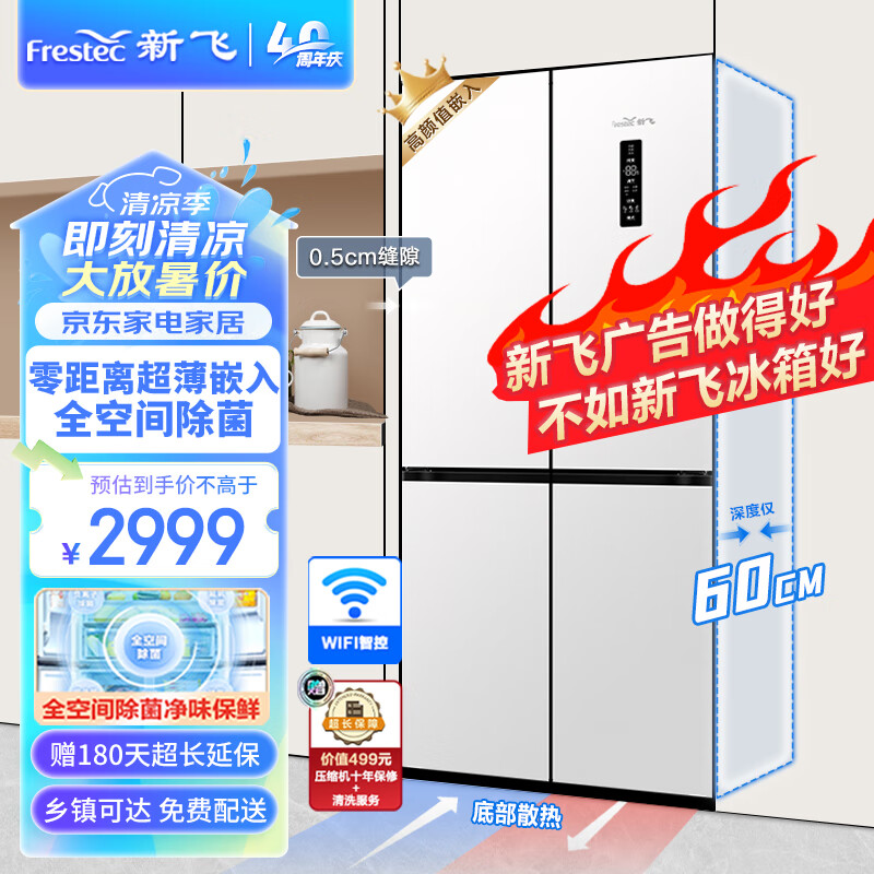 新飞60cm超薄零嵌入式445L十字对开门家用电冰箱一级变频底部散热全空间除菌平嵌无霜BCD-445WKQ8AT白价格:2999.00元!