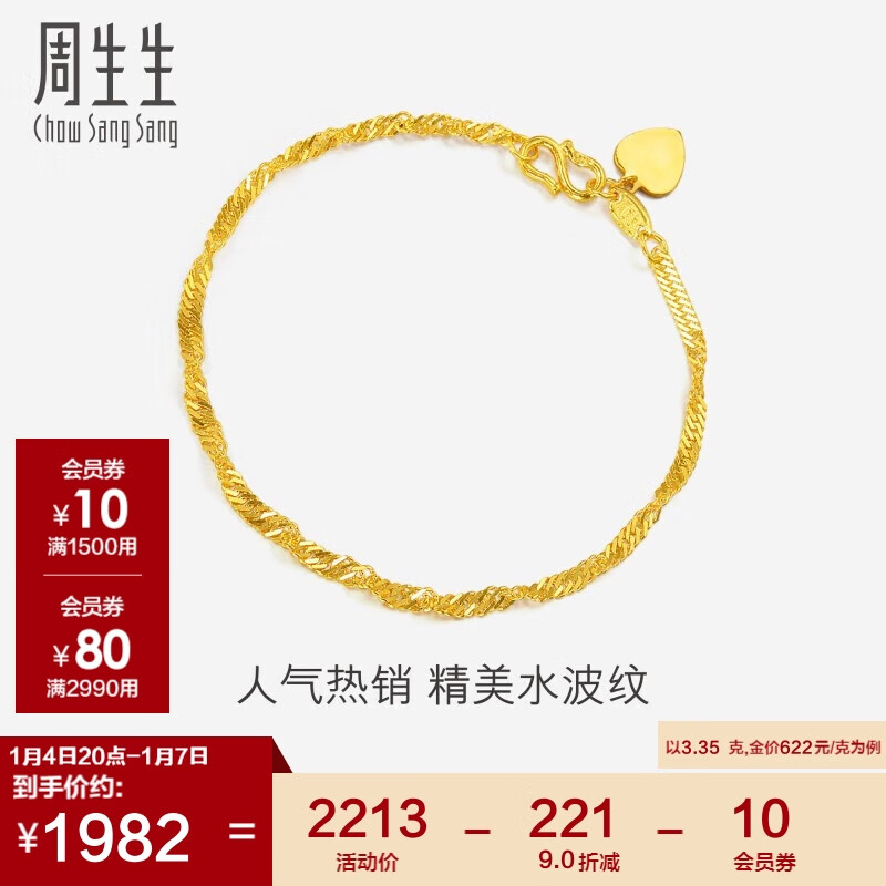 周生生黄金足金侧身水波纹手链 09240B 计价 17厘米 3.35克价格:2213.00元!
