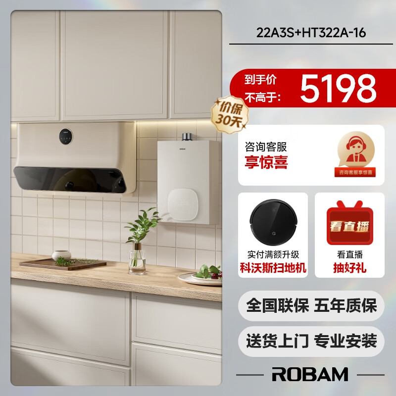 老板(Robam)抽油烟机空间大师A3S白色新物种超薄近吸23风量变频吸油烟机家用16升燃气热水器22A3S+HT322A-16价格:5498.00元!