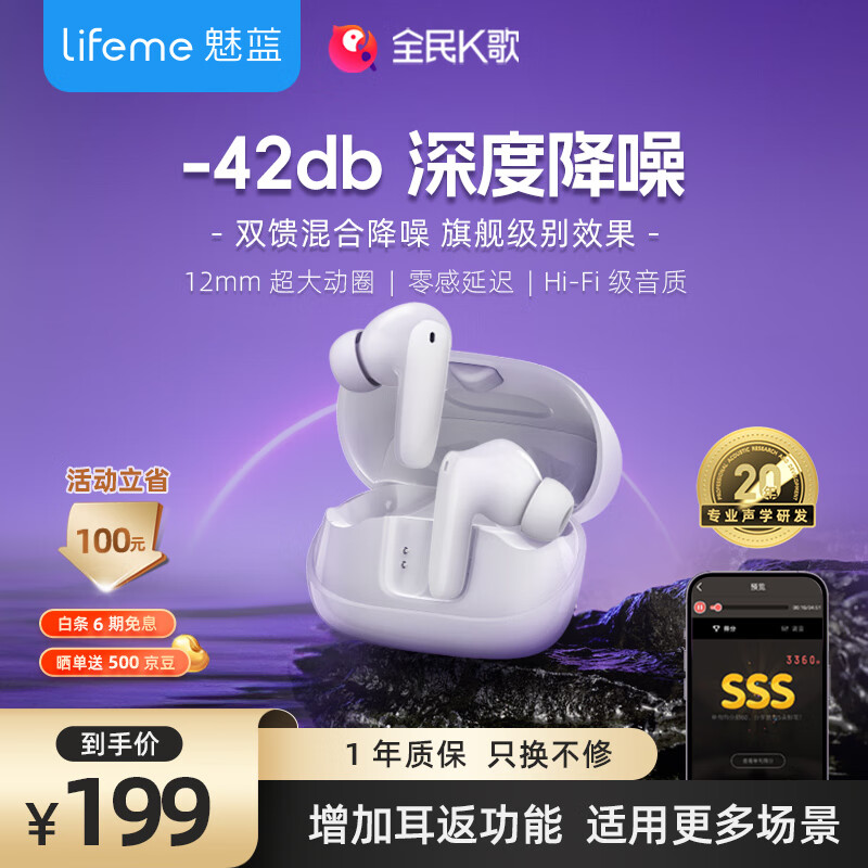 魅蓝魅族lifeme Blusk 真无线蓝牙耳机 42dB主动降噪 k歌调音 带监听耳返k歌功能适用苹果华为手机价格:299.00元!