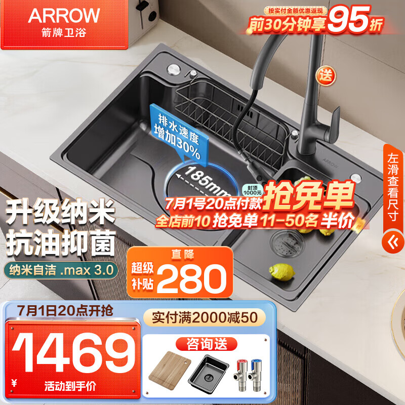 箭牌(ARROW)304不锈钢日式水槽大单槽洗菜盆纳米台上台中台下洗碗池 75*48纳米单槽-冷热枪灰抽拉龙头价格:1799.00元!
