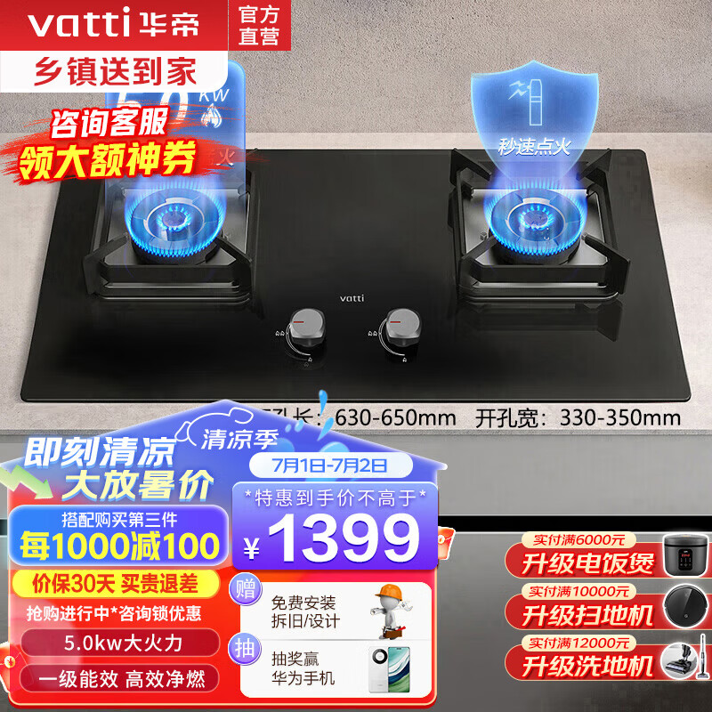 华帝(VATTI)i10073B燃气灶官方嵌入式台式双灶具5.0kw猛火灶台多档火力精控一级能效易清洁 燃气灶 天然气价格:1399.00元!
