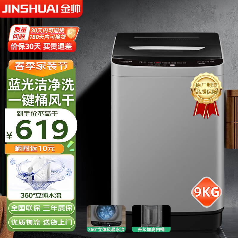 金帅9公斤全自动洗衣机波轮大容量家用小型租房宿舍 蓝光洗护 24小时预约定时 XQB90-3668月光灰价格:619.00元!