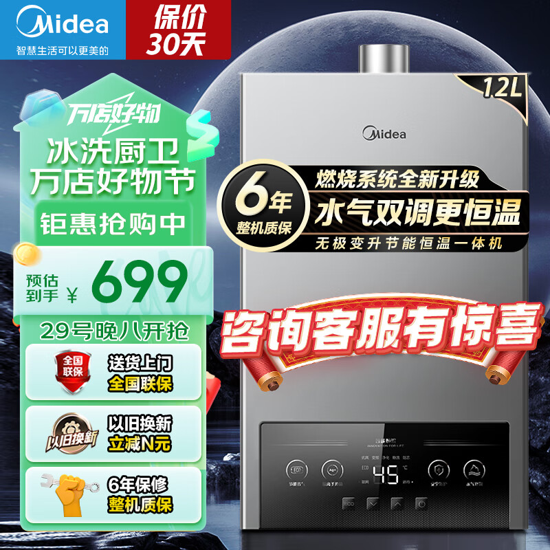 美的(Midea)燃气热水器水气双调ECO节能25%无极变升四季恒温智能免调多重安防LED大屏双重防冻开机自检MK1耀影 12L 【一厨一卫】 天然气价格:999.00元!