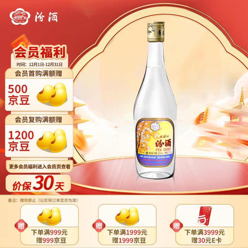 汾酒 出口玻汾 清香型白酒 53度 500ml*1瓶价格:63.00元!
