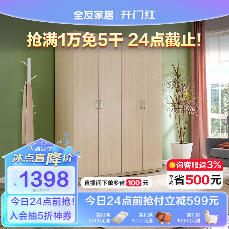 全友家居 衣柜现代简约平开门衣柜卧室家具四门大衣柜106302 四门衣柜价格:1997.14元!