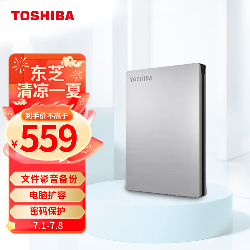 东芝(TOSHIBA)2TB 移动硬盘机械 Slim系列 USB3.2 Gen 1 2.5英寸 银色 兼容Mac 金属超薄 密码保护 轻松备份价格:559.00元!