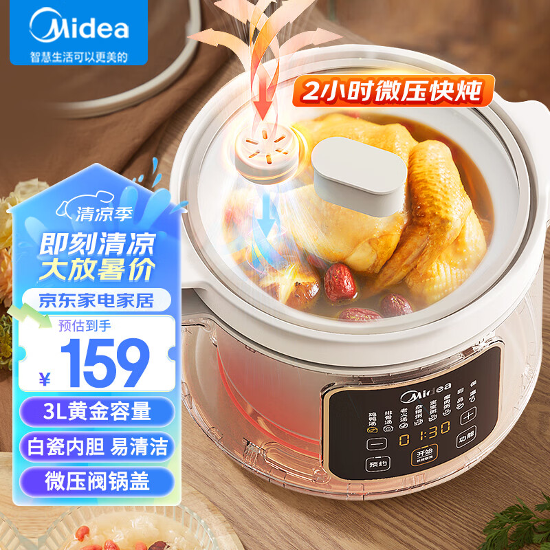 美的(Midea)电炖锅 电炖盅 煲汤锅炖汤锅 电砂锅 家用煮粥神器 婴儿辅食锅 微压快炖MD-DGE3001价格:179.00元!