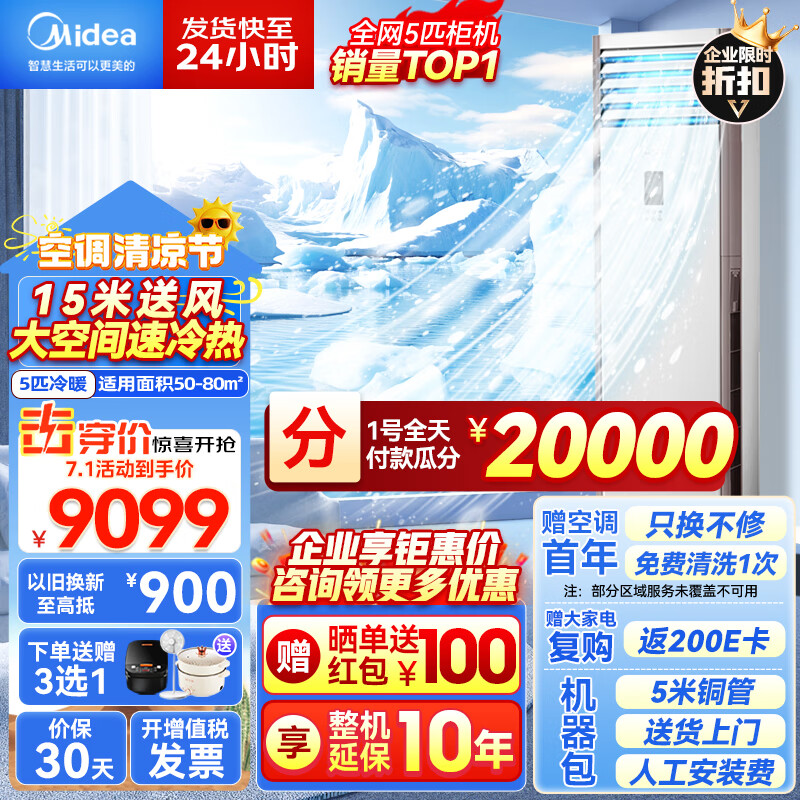 美的(Midea)中央空调5匹柜式空调 5p立式商用柜机 冷暖变频新能效380V RFD-120LW/BSDN8Y-PA401(B3)A包5米铜管价格:9099.00元!