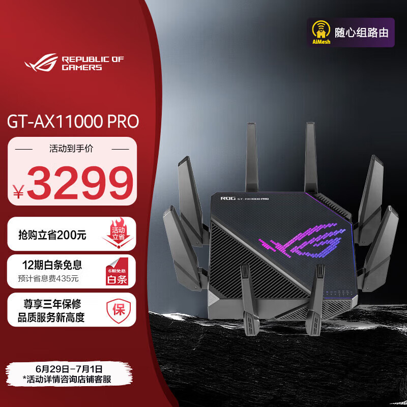 华硕(ASUS)ROG GT-AX11000 Pro无线路由器千兆/三频万兆电竞路由器WiFi6/穿墙王/八爪鱼Pro/Ai路由器价格:3499.00元!