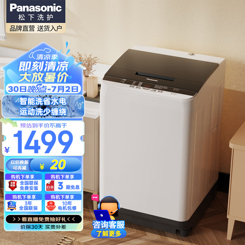 松下洗衣机波轮全自动10公斤家用大容量智洗加宽瀑布流桶自洁线屑过滤免清洗1Q1A XQB100-1Q1A价格:1699.00元!